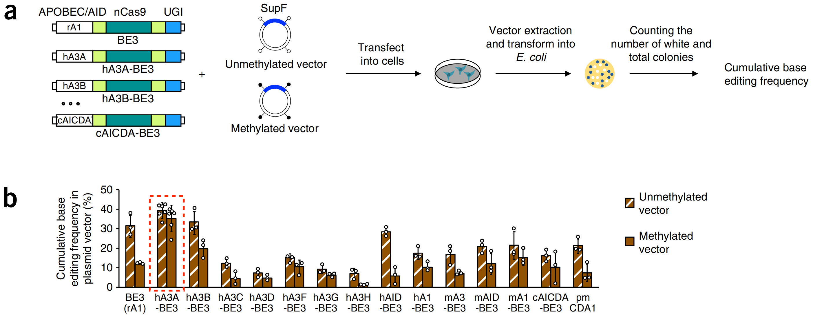 (a)構(gòu)建多種堿基編輯器并篩選其在高甲基化區(qū)域的編輯效率。(b)基于人APOBEC3A的堿基編輯器(hA3A-BE3)能夠在高甲基化區(qū)域進(jìn)行高效堿基編輯。