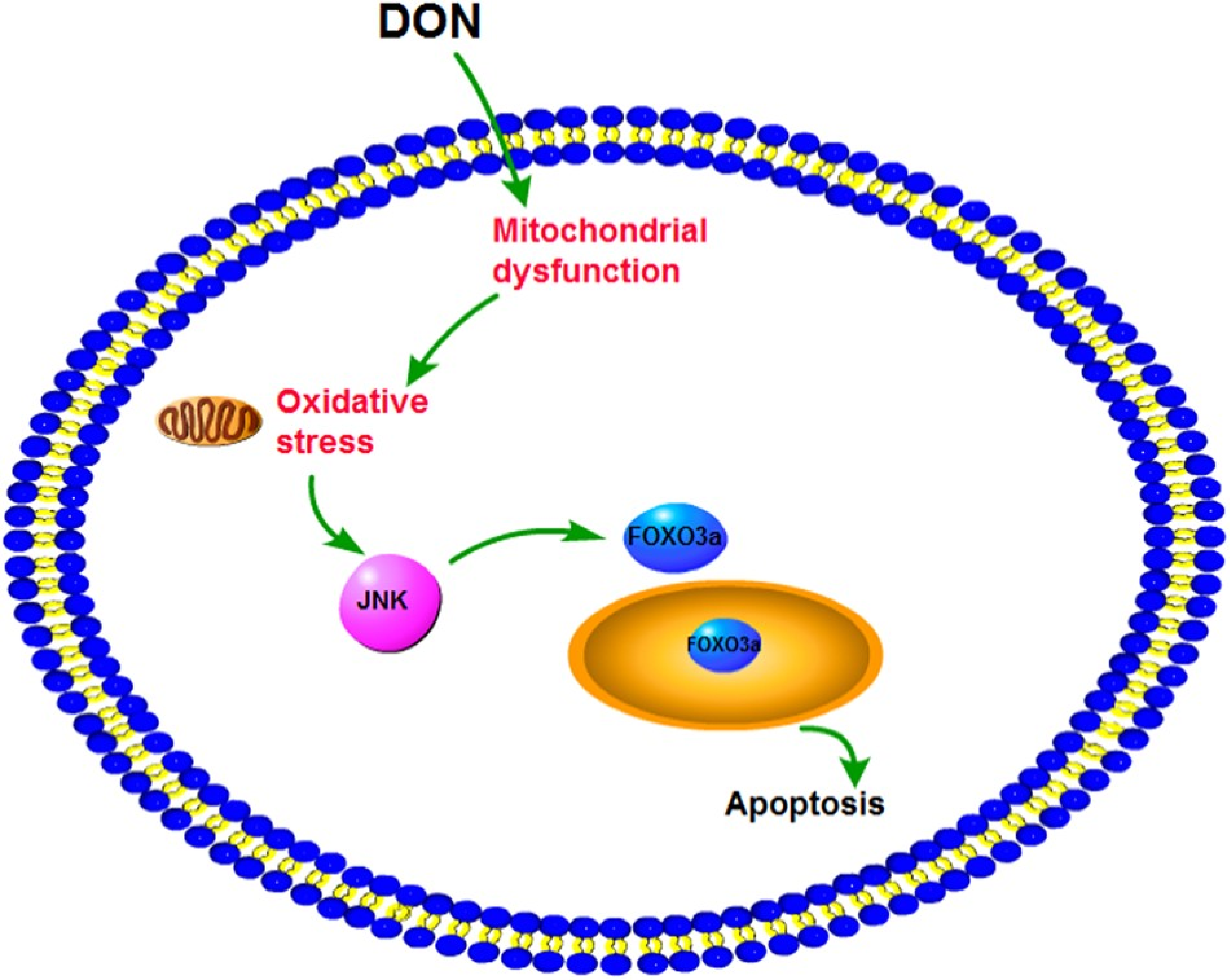 博士研究生楊云霞等基于DON毒素的致嘔特性,選擇胃腸系統(tǒng)中的人源性細(xì)胞GES-1與DON毒素暴露互作。研究結(jié)果表明,DON暴露可誘導(dǎo)GES-1細(xì)胞發(fā)生氧化應(yīng)激,線粒體功能失調(diào),激活ROS-JNK-FOXO3a信號通路;活化的FOXO3a發(fā)揮轉(zhuǎn)錄調(diào)節(jié)作用,影響細(xì)胞的抗氧化、周期阻滯及凋亡。還通過模式生物線蟲對FOXO3a(同系物DAF16)進行了體內(nèi)生物學(xué)功能驗證。