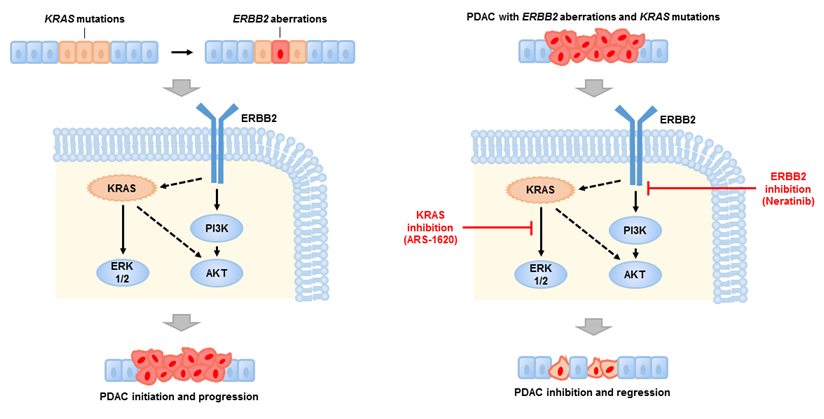 圖(左):ERBB2基因改變加速了KRAS驅(qū)動(dòng)的PDAC惡性進(jìn)展