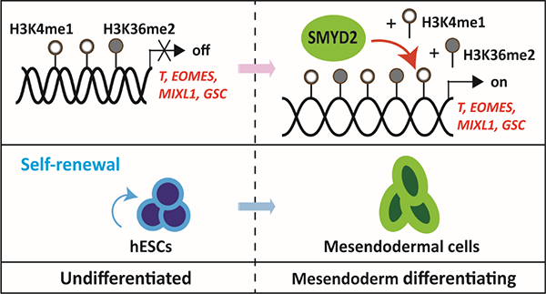 圖示:組蛋白甲基轉(zhuǎn)移酶SMYD2通過維持中內(nèi)胚層的重要轉(zhuǎn)錄因子(T、EOMES、MIXL1、GSC)啟動子區(qū)域的H3K4me1和H3K36me2,進(jìn)而激活相關(guān)基因轉(zhuǎn)錄和促進(jìn)人胚胎干細(xì)胞向早期中內(nèi)胚層分化。