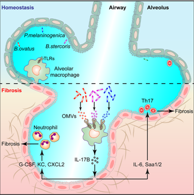 圖注:肺組織中異常升高的微生物菌群通過(guò)分泌OMVs調(diào)控巨噬細(xì)胞IL-17B的產(chǎn)生從而促進(jìn)肺纖維化病理發(fā)生。