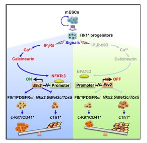 王毅潔博士和黃吉均博士等在楊黃恬研究員指導(dǎo)下發(fā)現(xiàn)ESCs自我更新和三胚層形成并不依賴于IP3Rs,然而造血中胚層(Flk1+/PDGFRa-)的出現(xiàn)依賴于IP3Rs介導(dǎo)的鈣信號(hào),這一鈣信號(hào)的缺失抑制中胚層向造血譜系分化但促進(jìn)其向心肌譜系的分化。在機(jī)制方面,IP3Rs釋放的Ca2+而非細(xì)胞外的Ca2+內(nèi)流通過激活鈣調(diào)磷酸酶(calcineurin), 進(jìn)而使得下游的NFATc3結(jié)合到調(diào)控造血發(fā)生的轉(zhuǎn)錄因子Etv2啟動(dòng)子促進(jìn)其表達(dá),進(jìn)而誘導(dǎo)造血細(xì)胞分化而防止心肌細(xì)胞分化。研究發(fā)現(xiàn)并揭示了IP3RsESCs向造血和心肌這兩種具有同一胚層祖先的譜系命運(yùn)決定中的重要作用,進(jìn)一步證實(shí)Ca2+信號(hào)對(duì)于細(xì)胞命運(yùn)調(diào)控的重要性和精確性。