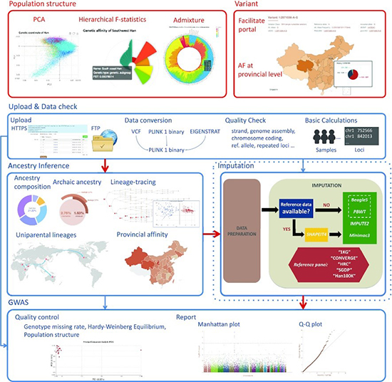 經(jīng)過(guò)多年的努力和積累,徐書(shū)華研究組聯(lián)合多家研究單位,促成10萬(wàn)人漢族基因組計(jì)劃(The Han100K Initiative)的啟動(dòng)和實(shí)施。Han100K計(jì)劃的成員單位和合作者可以通過(guò)鏈接(https://www.hanchinesegenomes.org/HCGD/about)查詢(xún),并且處于持續(xù)更新中。作為該計(jì)劃一期成果,漢族基因組數(shù)據(jù)庫(kù)及在線分析平臺(tái)(PGG.Han)肩負(fù)著重要使命。PGG.Han是目前唯一針對(duì)漢族人群的、也是最大規(guī)模的、集數(shù)據(jù)存儲(chǔ)、發(fā)布與在線分析為一體的參考基因組數(shù)據(jù)平臺(tái)。當(dāng)前上線的PGG.Han版本主要基于對(duì)早前基因組數(shù)據(jù)的收集和分析整理,更專(zhuān)注于提供平臺(tái)和構(gòu)架,為后期持續(xù)納入的高質(zhì)量深度測(cè)序數(shù)據(jù)奠定基礎(chǔ)。目前PGG.Han的漢族樣本在地理分布上共覆蓋了33個(gè)省級(jí)行政地區(qū)及部分海外漢族群體。PGG.Han不僅提供了漢族人群的精細(xì)人群遺傳結(jié)構(gòu)圖譜和可視化等位基因頻率地圖,更重要的是還整合了三個(gè)實(shí)用性強(qiáng)的在線分析工具;包括祖源推斷(AncestryInference),基因型填補(bǔ)(Genotype Imputation)和全基因組關(guān)聯(lián)分析(GWAS)。這些分析流程由徐書(shū)華研究組設(shè)計(jì)與開(kāi)發(fā),由生物醫(yī)學(xué)大數(shù)據(jù)中心進(jìn)行軟件封裝,并首次提供免費(fèi)公開(kāi)訪問(wèn)和使用。用戶(hù)可以上傳自己的樣本數(shù)據(jù),充分利用數(shù)據(jù)庫(kù)中存儲(chǔ)的漢族自然人群參考數(shù)據(jù)集進(jìn)行在線分析,最終得到可供下載的分析報(bào)告。所有上傳數(shù)據(jù)均受到嚴(yán)格的保護(hù),同時(shí)考慮了非計(jì)算生物學(xué)背景人員的可操作性,并在持續(xù)改善用戶(hù)體驗(yàn)。目前正力圖通過(guò)廣泛合作持續(xù)納入更多高質(zhì)量深度測(cè)序數(shù)據(jù),以及提升該數(shù)據(jù)庫(kù)所依賴(lài)的高性能計(jì)算分析能力。