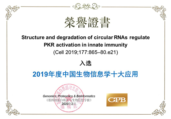 2020年2月,楊力研究組的一項合作研究—“Structure and Degradation of Circular RNAs Regulate PKR Activation in Innate Immunity” (Liu et al, Cell 2019) 成功入選由《基因組蛋白質(zhì)組與生物信息學報》(Genomics, Proteomics & Bioinformatics) 組織評選的2019年度“中國生物信息學十大應用”。