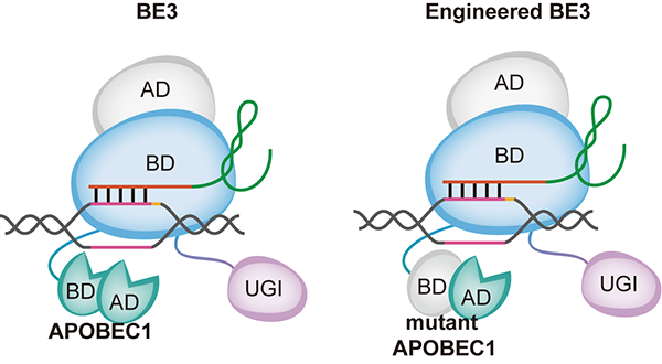 圖:經(jīng)典的BE3單堿基編輯工具APOBEC1脫氨酶具有ssDNA結(jié)合區(qū)域BD和催化活性區(qū)域AD(左側(cè)圖)。YE1-BE3-FNLS單堿基編輯工具APOBEC1脫氨酶丟失了ssDNA結(jié)合區(qū)域BD保留了催化活性區(qū)域AD(右側(cè)圖)。