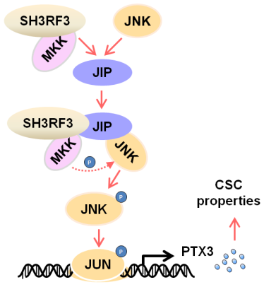 此項研究發(fā)現(xiàn),在乳腺癌細胞模型中,過表達SH3RF3提升了乳腺癌細胞的腫瘤細胞球形成能力及其致瘤性。在乳腺癌病人來源的類器官體中同樣證實了SH3RF3對腫瘤干性特征的促進作用。這表明SH3RF3的表達能夠提升乳腺癌細胞的干性特征,增強乳腺癌細胞的惡性程度。機制研究表明,SH3RF3能夠與MKK-JNK復合體相互作用,以JIP依賴的方式促進JNK-JUN信號通路的激活,進而促進PTX3的表達,最終提升腫瘤細胞干性特征,增強腫瘤細胞的惡性程度。病人來源的腫瘤樣本分析也證實SH3RF3與腫瘤細胞的干性特征存在明顯的相關性,并與病人的不良預后相關。