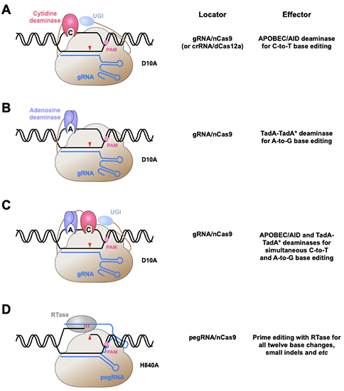 Figure 1. Cas9nickase作為locator和核酸脫氨編輯酶或逆轉錄酶作為effector相結合構成一系列高效的基因組新型堿基編輯系統(tǒng)。