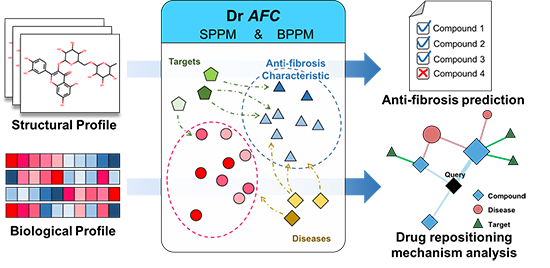 藥物重定位指將已有藥物再利用,將其應(yīng)用于新的疾病。與傳統(tǒng)的藥物研究相比,藥物的重定位具有巨大的優(yōu)勢(shì),其大大縮短藥物研發(fā)周期,降低成本并降低潛在風(fēng)險(xiǎn),現(xiàn)已成為藥物研發(fā)中重要策略之一。然而,如何不斷優(yōu)化藥物重定位方法和模型則成為目前需要攻克的難點(diǎn)。纖維化是許多疾病致病機(jī)制中的關(guān)鍵病理過(guò)程,這些涉及到纖維化的疾病具有共同的機(jī)制和治療靶點(diǎn),具有共同的治療方法和藥物。因此,研究團(tuán)隊(duì)開(kāi)發(fā)了基于化合物抗纖維化特征的藥物重定位預(yù)測(cè)算法,在預(yù)測(cè)模型中引入抗纖維化的特征,提高重定位的成功率。
