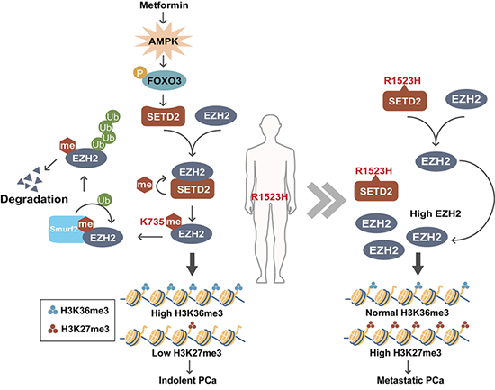 研究人員利用小鼠模型及病人數(shù)據(jù)分析,揭示SETD2的缺失顯著促進(jìn)前列腺癌的遠(yuǎn)端轉(zhuǎn)移。闡明SETD2通過對EZH2 K735位點甲基化修飾促進(jìn)EZH2降解,防止細(xì)胞轉(zhuǎn)化為高H3K27me3染色質(zhì)狀態(tài),進(jìn)而抑制轉(zhuǎn)移性前列腺癌的形成的分子機(jī)制。EZH2缺失或K735R點突變小鼠模型表明SETD2缺失促進(jìn)前列腺癌進(jìn)展主要依賴于其對于EZH2甲基化修飾的調(diào)控。有趣的是,SETD2在腫瘤中存在R1523H熱點突變位點。該位點突變后可以抑制SETD2與EZH2相互作用進(jìn)而缺失EZH2的K735位點甲基化修飾。因此,該突變以不改變H3K36me3修飾的方式促進(jìn)腫瘤進(jìn)展。此外,本研究還發(fā)現(xiàn)AMPK-FOXO3信號通路可以感受胞外能量變化調(diào)控SETD2的表達(dá)水平。二甲雙胍激活A(yù)MPK-FOXO3-SETD2信號軸可以抑制EZH2高表達(dá)前列腺癌的進(jìn)展。