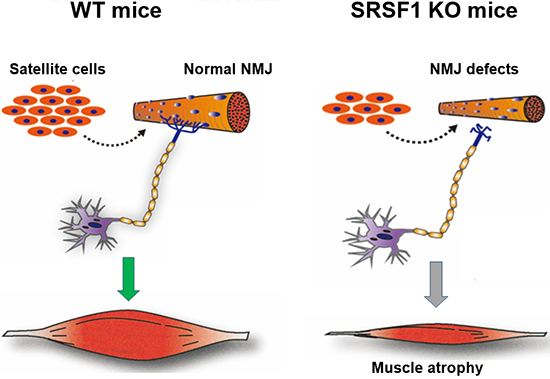 在馮英研究員的指導(dǎo)下,博士生劉玉國、羅陽君等利用骨骼肌單根肌纖維體外培養(yǎng)及其衛(wèi)星細(xì)胞分離和培養(yǎng)技術(shù),結(jié)合免疫熒光染色分析,發(fā)現(xiàn)SRSF1能夠在衛(wèi)星細(xì)胞激活和增殖階段特異性的表達(dá),提示SRSF1可能參與了衛(wèi)星細(xì)胞增殖過程的調(diào)控。然后利用MyoDcre小鼠構(gòu)建骨骼肌特異性敲除SRSF1的小鼠,通過流式細(xì)胞術(shù)分選和體外培養(yǎng)骨骼肌原代衛(wèi)星細(xì)胞,研究發(fā)現(xiàn),SRSF1的缺失會顯著降低衛(wèi)星細(xì)胞的體外擴(kuò)增能力;通過圍產(chǎn)期EdU體內(nèi)標(biāo)記和追蹤分析發(fā)現(xiàn),SRSF1的缺失同樣顯著降低衛(wèi)星細(xì)胞的體內(nèi)增殖能力。同時研究發(fā)現(xiàn)敲除小鼠表現(xiàn)出明顯的肌萎縮和肌無力,與人類CMS癥狀高度一致。借助于膈肌整體包埋染色技術(shù)(Whole mount staining),研究發(fā)現(xiàn)SRSF1缺失小鼠中存在大量不成熟的NMJ結(jié)構(gòu),其典型表現(xiàn)為:無效的神經(jīng)末梢(Nerve terminal)-乙酰膽堿受體(AchR)共定位;NMJ染色區(qū)域變寬;Nerve terminal和AchR的數(shù)量變多而體積變小。最后證明,SRSF1通過調(diào)控組織特異性剪接事件而參與小鼠骨骼肌的發(fā)育和功能的維持。