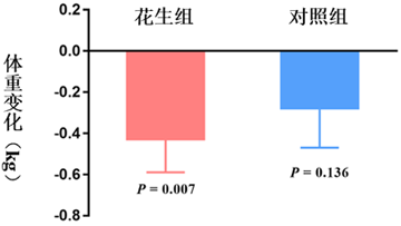在由林旭研究員牽頭的本項營養(yǎng)干預研究中,博士生汪荻,副研究員孫亮通過與復旦大學附屬華東醫(yī)院上海臨床營養(yǎng)中心合作,招募到224名根據國際糖尿病聯盟(IDF)中國人的標準定義的代謝綜合征或高風險的志愿者(腹型肥胖伴有一項代謝綜合征風險因素),并將其隨機分配到花生干預組(共113人)或對照組(共111人)。在12周的干預過程中,志愿者每日在午餐和晚餐前一小時分別食用一小包28克的輕鹽烤花生,或一份與烤花生等能量的白米糕(每日花生和白米糕均為1392千焦耳/日,約占20%每日總能量攝入)。所有志愿者均被告知維持他們干預前的膳食習慣和體力活動水平,干預中未完成的干預食物均被詳細記錄。通過比較兩組志愿者在干預前后的數據發(fā)現:1)花生干預組代謝綜合征的逆轉率(即干預前符合IDF中國人診斷標準的代謝綜合征志愿者在12周干預后不再符合此標準的比例)是對照組的2.33倍(RR 2.33; 95% CI: 1.10,4.89; P = 0.026)(圖1A);2)在花生干預組高代謝綜合征風險個體中的風險因素數量降低的比例為23.1%,高于對照組的14.3%,雖未達到統計顯著性(圖1B);3)盡管花生脂肪含量較高,但12周干預后花生組志愿者的體重比干預前呈邊緣顯著降低(P = 0.007)(圖2)??傊?,每日攝入適量花生替代部分精制谷物攝入,可以在不增加體重的情況下改善高風險個體的心血管代謝健康。