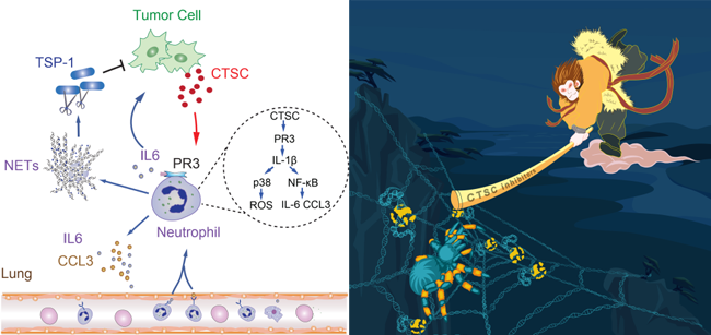 CTSC調控中性粒細胞及乳腺癌肺轉移的功能機制模式及卡通示意圖
