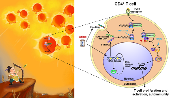 衰老CD4+ T細(xì)胞中DNA感知促進(jìn)其活化與自身免疫性炎癥的卡通與機(jī)制示意圖