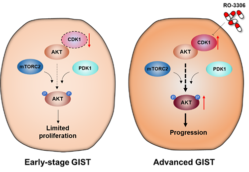 圖:CDK1是伊馬替尼耐藥GIST的進(jìn)攻弱點(diǎn)。(左)早期GIST中CDK1 不表達(dá),腫瘤細(xì)胞的增殖能力有限;(右)晚期GIST中CDK1高表達(dá),激酶CDK1結(jié)合其底物AKT并磷酸化473位絲氨酸和308位酪氨酸,從而促進(jìn)GIST的增殖和進(jìn)展。