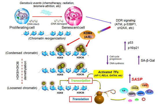 圖.KDM4介導(dǎo)的表觀修飾在衰老細(xì)胞中引起全基因組3D空間變化和染色質(zhì)拓?fù)渲厮茏罱K造成SASP持續(xù)性高度表達(dá)