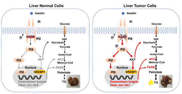 糖脂代謝是機體與細胞獲取能量和物質(zhì)來源的重要生物過程。胰島素及其信號通路作為調(diào)控糖脂代謝最為重要的環(huán)節(jié)之一,該信號通路的失調(diào)可能引起糖脂代謝穩(wěn)態(tài)失衡,進而引發(fā)糖尿病、脂肪肝、心血管疾病以及多種癌癥等。肝癌是臨床上常見的惡性腫瘤之一,其發(fā)生率和死亡率在世界范圍內(nèi)分別高居所有癌癥的第六位和第四位。我國肝癌發(fā)病人數(shù)約占全球新發(fā)病率的一半以上,死亡率僅次于肺癌和胃癌。既往研究發(fā)現(xiàn)在多種腫瘤發(fā)生發(fā)展過程中,胰島素信號通路與脂肪酸合成均顯著上調(diào)。更為有趣的是本實驗室前期研究發(fā)現(xiàn)在肝癌中ALDOB下調(diào),其表達水平與肝癌病人預后密切相關。因此,研究胰島素信號通路對糖脂代謝的調(diào)控機制及其在肝癌發(fā)病過程中的重要性不言而喻。