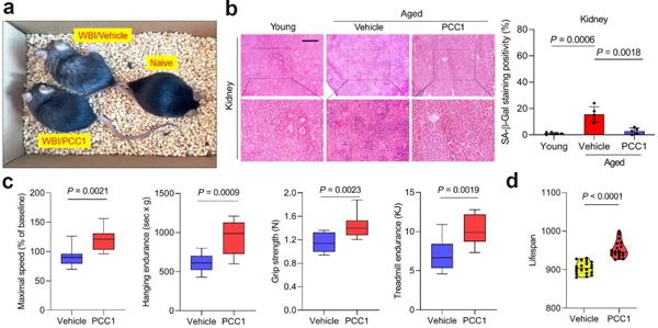 研究人員隨后在多種小鼠模型中論證PCC1清除體內(nèi)衰老細胞的有效性和安全性,結(jié)果證明在自然衰老的老年小鼠模型中,PCC1能清除老年小鼠多種組織器官類型中的衰老細胞,增強小鼠生理機能并延長老年小鼠壽命。