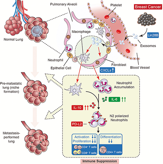 在本研究中,研究人員首先依據(jù)人乳腺癌組織芯片樣本和公共數(shù)據(jù)庫(kù)信息,發(fā)現(xiàn)多潛能因子Lin28B的高表達(dá)與乳腺癌(特別是三陰性乳腺癌)患者預(yù)后不良密切相關(guān),Lin28B高表達(dá)特異促進(jìn)肺轉(zhuǎn)移,與骨轉(zhuǎn)移和腦轉(zhuǎn)移無(wú)關(guān)。進(jìn)一步,研究人員通過(guò)特定乳腺癌原位移植小鼠模型證明了Lin28B的促轉(zhuǎn)移前免疫微環(huán)境抑制作用,而這是乳腺癌肺轉(zhuǎn)移關(guān)鍵因素。機(jī)制上,他們發(fā)現(xiàn),Lin28B表達(dá)使轉(zhuǎn)移前肺組織中性粒細(xì)胞聚集增多和N2轉(zhuǎn)化新機(jī)制,證實(shí)PD-L2和異常表達(dá)的細(xì)胞因子流調(diào)控N2轉(zhuǎn)化的中性粒細(xì)胞增高,從而抑制轉(zhuǎn)移前肺組織CD4+/CD8+ T細(xì)胞的增殖、活化和Th1分化,因而促進(jìn)局部抑制性免疫微環(huán)境形成。在此基礎(chǔ)上,他們發(fā)現(xiàn)原發(fā)腫瘤外泌體足以誘導(dǎo)轉(zhuǎn)移前肺組織免疫抑制和肺轉(zhuǎn)移發(fā)生,Lin28B表達(dá)使原位腫瘤內(nèi)ALDH+干細(xì)胞比例上調(diào),這群細(xì)胞分泌的外泌體由包含低含量的let-7s家族成員,導(dǎo)致轉(zhuǎn)移前肺組織成纖維細(xì)胞、中性粒細(xì)胞和巨噬細(xì)胞分別釋放增多的CXCLs、IL-6和IL-10,由此引起中性粒細(xì)胞召集和N2轉(zhuǎn)化。因此,當(dāng)采用IL-6和PD-L2的聯(lián)合干預(yù),明顯解除轉(zhuǎn)移前肺組織的免疫抑制,抑制Lin28B引起的肺轉(zhuǎn)移,表明免疫抑制是Lin28B引起肺轉(zhuǎn)移的關(guān)鍵機(jī)制以及早期機(jī)制。