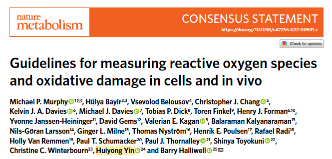 中科院上海營養(yǎng)與健康研究所尹慧勇研究員受邀參與制定活性氧ROS(Reactive Oxygen Species)及氧化損傷的體內(nèi)、體外檢測的國際指南,與來自美國、英國、丹麥、俄羅斯、德國、卡塔爾、日本、瑞典、新西蘭、烏拉圭、中國、新加坡等25位氧化應(yīng)激領(lǐng)域的國際著名學(xué)者一起,在國際知名學(xué)術(shù)期刊Nature Metabolism在線發(fā)表了題為“Guidelines for measuring reactive oxygen species and oxidative damage in cells and in vivo”的文章。