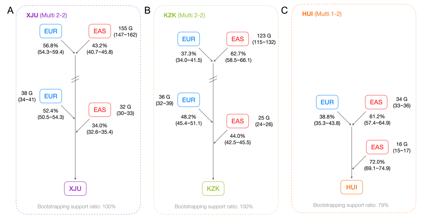 圖1. 維吾爾族(XJU)、哈薩克(KZK)和回族(HUI)人群的混合模式。