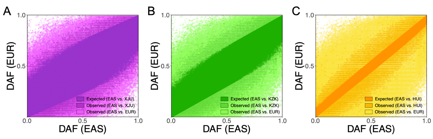 圖2. 維吾爾族(XJU)、哈薩克(KZK)和回族(HUI)人群混合后的全基因組等位基因頻譜。