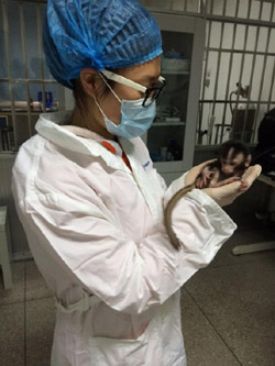 手術(shù)臺前,師兄、師姐運用熟練的技術(shù)全神貫注地為這個即將到來的小生命忙碌著?!俺鰜砹?,出來了!”小紅師姐激動地喊道。看到王燕師姐捧著一個小家伙笑著走出來,大家紛紛湊上去圍觀,緊張的氣氛也因此活躍起來。從旁待命的獸醫(yī)也上前一步接過了小家伙,將它放進了保溫箱,同時不斷地擦拭它的身體,以免羊水堵住呼吸道。由于不足月,小家伙還不及我們手掌大,獸醫(yī)檢查后,發(fā)現(xiàn)它呼吸微弱,并逐漸沒有了叫聲,還不時地打噴嚏。一邊是剛生產(chǎn)完極度虛弱的母猴,一邊是命懸一線的小猴,手術(shù)間又重新安靜了下來,所有人的心都繃得快要提到嗓子眼,每個人都為了能搶救過來這兩條鮮活的生命盡心盡力地貢獻著自己的每一份力量。最終,小家伙的呼吸漸漸趨于平緩,可是大家的心卻不敢放下來,小家伙太弱了還不能自主吸食,必須人工照看喂養(yǎng),每隔3至4個小時就得喂養(yǎng)一次,我們就這樣開始不分晝夜地充當奶爸、奶媽的角色。以這種形式進行人工喂養(yǎng)的仔猴,我們已經(jīng)記不清有多少只了,可每次都會因為又撫養(yǎng)了一個小生命,而覺得自己好偉大。?