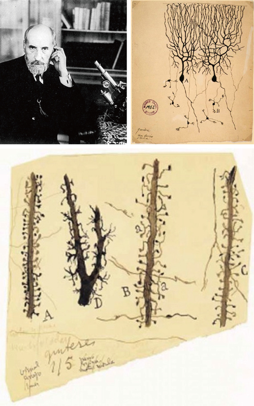 圖1:西班牙著名的神經(jīng)生物學(xué)家Santiago Ram ny Cajal(1852-1934)與其手繪的小腦浦肯野神經(jīng)元以及不同形態(tài)的樹突棘。圖片引自參考文獻[1]。