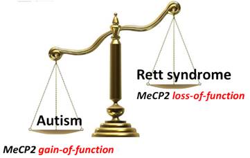 在這些相關(guān)的基因中,一個名叫甲基化CpG島結(jié)合蛋白2(MeCP2)的基因,以其有趣的特征吸引了研究者們的注意。MeCP2基因編碼一種甲基化DNA結(jié)合蛋白,它本身雖然不直接參與到神經(jīng)突觸的結(jié)構(gòu)和功能中,但卻可以通過結(jié)合DNA的甲基化CpG島或是“招募”轉(zhuǎn)錄因子來操縱與神經(jīng)突觸功能及調(diào)控相關(guān)基因的表達,從而間接的對神經(jīng)功能造成影響。當MeCP2基因因突變或者缺失喪失功能時,可導(dǎo)致Rett syndrome;而當MeCP2的基因拷貝數(shù)異常增多時,卻又會導(dǎo)致患者具有嚴重自閉癥癥狀的疾病,被命名為MeCP2倍增綜合癥(MECP2 duplication syndrome)。由此可見,體內(nèi)MeCP2這個基因的表達量如同一座天平,必須保持著精妙的平衡,無論過多或者過少,都會導(dǎo)致神經(jīng)突觸及神經(jīng)系統(tǒng)功能的異常,從而導(dǎo)致自閉癥(圖3)。?
