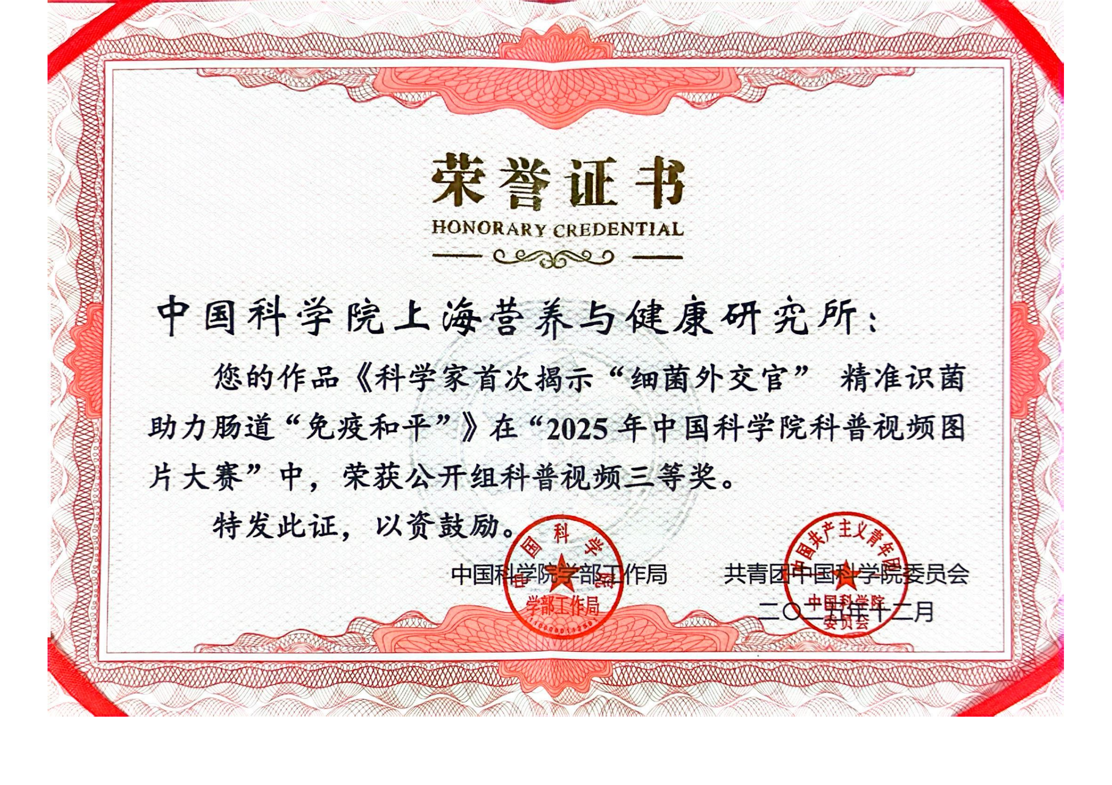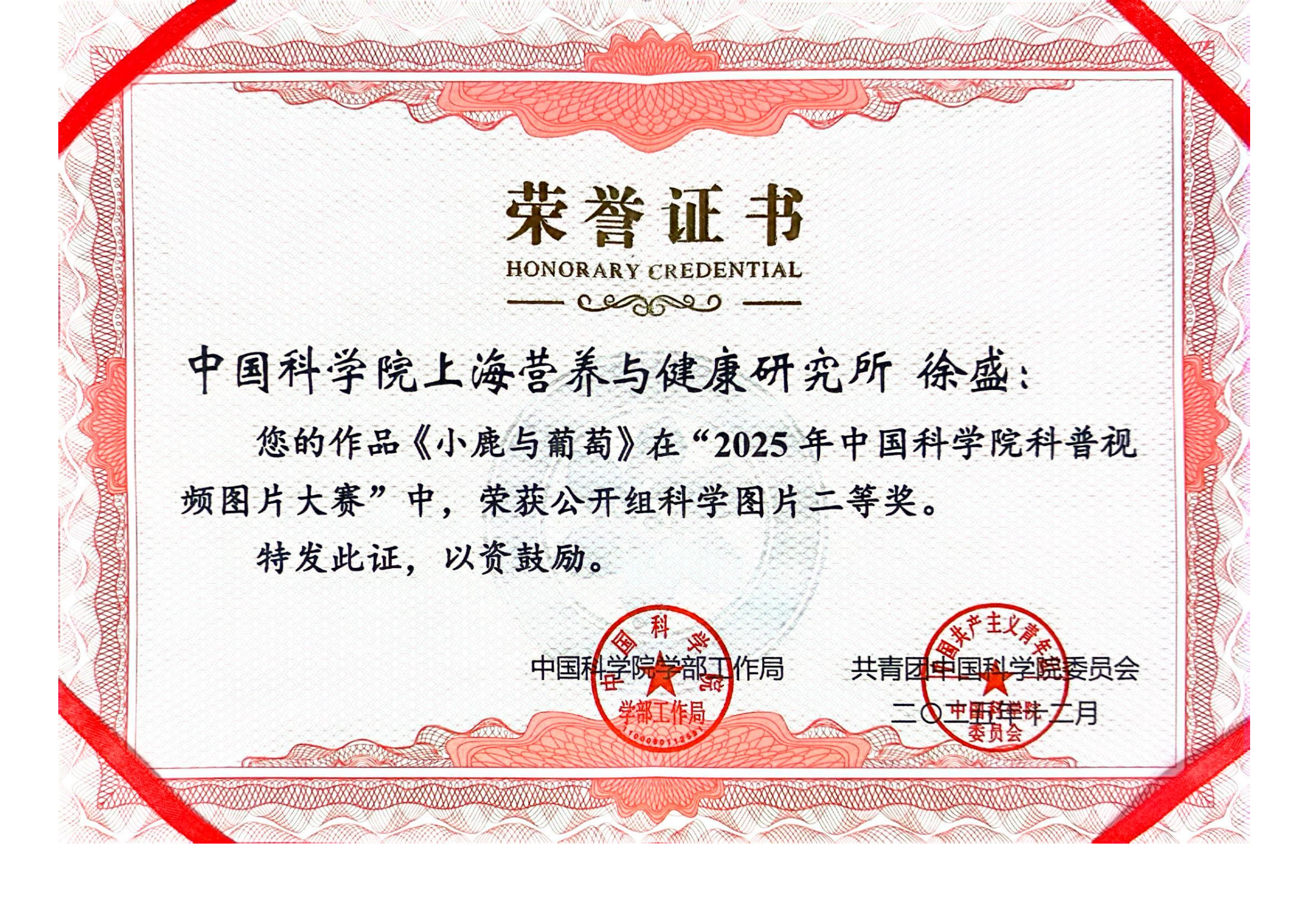 近日,2025年中國科學(xué)院科普視頻圖片大賽獲獎名單揭曉,中國科學(xué)院上海營養(yǎng)與健康研究所選送的多項科普作品斬獲佳績。其中,博士后徐盛創(chuàng)作的《小鹿與葡萄》榮獲公開組科學(xué)圖片二等獎,研究所基于錢友存研究組科研成果創(chuàng)作的《科學(xué)家首次揭示“細菌外交官” 精準(zhǔn)識菌助力腸道“免疫和平”》榮獲公開組科普視頻三等獎,研究生賀美美創(chuàng)作的《燕雀亦知鴻鵠之志》榮獲碩博組科學(xué)圖片優(yōu)秀獎。