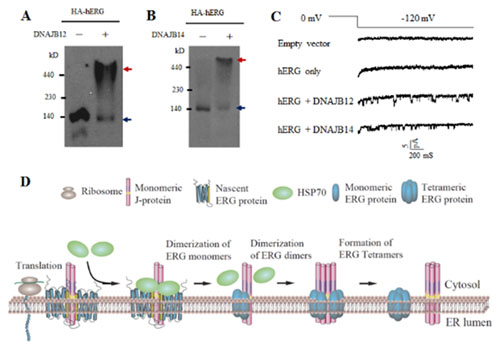 (A)體外重現(xiàn)DNAJB12促進(jìn)hERG四聚化組裝。(B)體外重現(xiàn)DNAJB12促進(jìn)hERG四聚化組裝。(C)共表達(dá)DNAJB12或DNAJB14可以促進(jìn)hERG在體外脂質(zhì)體上形成有功能的離子通道。(D)模式圖:定位在內(nèi)質(zhì)網(wǎng)上伴侶分子促進(jìn)ERG家族鉀離子通道四聚化組裝。