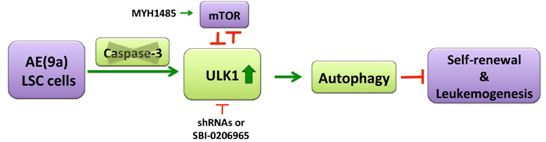 研究人員利用遺傳小鼠模型,證明Caspase-3缺失可以延緩t(8;21)白血病的發(fā)生。從分子水平研究揭示Caspase-3能夠直接切割自噬調(diào)控因子ULK1D458位點, Caspase-3的缺失能夠促進(jìn)ULK1蛋白激酶的上調(diào),從而促進(jìn)白血病細(xì)胞自噬。白血病中蛋白水解酶Caspase-3,一方面通過水解ULK1蛋白激酶,另一方面也可以通過mTOR/P70S6K/4EBP1信號通路,抑制細(xì)胞自噬發(fā)生。王蘭研究組通過與邁阿密大學(xué)腫瘤研究中心Stephen Nimer教授合作,證明Caspase-3及其調(diào)控的細(xì)胞自噬信號通路與白血病發(fā)生緊密相關(guān)。