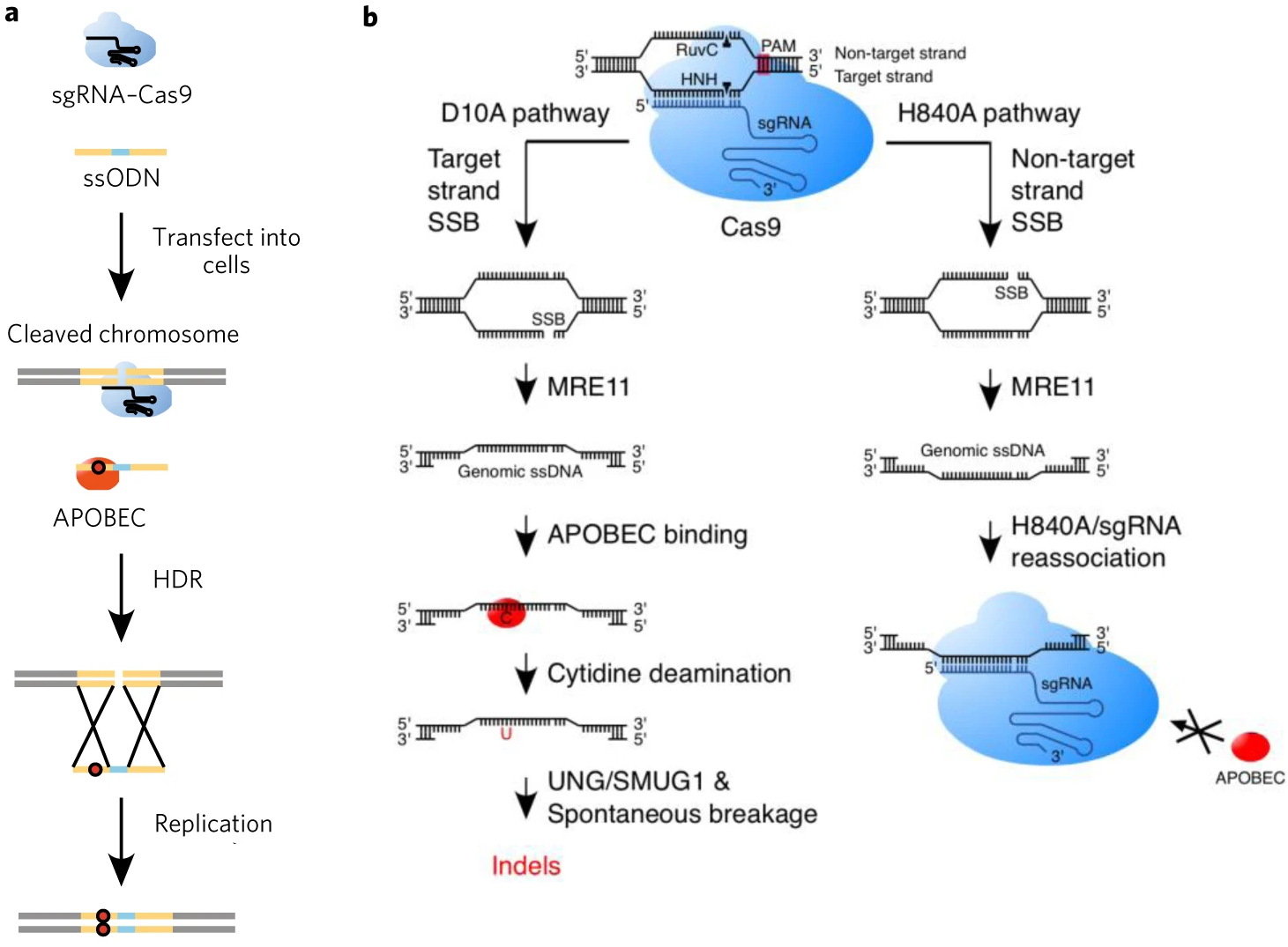 b.APOBEC在Cas9切刻酶D10A引起的單鏈斷裂修復(fù)過程中產(chǎn)生indel突變。