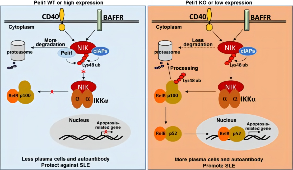 在本研究中,博士研究生劉俊利等在肖意傳研究員指導下,分別利用遺傳小鼠模型和臨床患者數(shù)據(jù)驗證,揭示Peli1可通過負調(diào)節(jié)非經(jīng)典NF-κB信號通路以抑制B細胞的自身抗體的產(chǎn)生,以及系統(tǒng)性紅斑狼瘡的發(fā)病。在遺傳小鼠模型中,Peli1在B細胞中缺失后可顯著促進B細胞的活化與抗體的產(chǎn)生,此外,Peli1缺失后會促進小鼠SLE的病理指征,包括更多的IgG在腎小球的沉積,以及血清中檢測到更多的抗核抗體和抗自身抗體。進一步的分子機制研究發(fā)現(xiàn),Peli1是非經(jīng)典NF-κB信號通路關(guān)鍵蛋白激酶NIK的特異性的E3泛素連接酶,并介導了NIK的K48連接的多聚泛素化與降解作用,因此,當Peli1缺失后,B細胞中NIK會大量積累,并持續(xù)活化非經(jīng)典NF-κB信號通路,進而促進了B細胞的活化與自身抗體的產(chǎn)生。與之相應,在臨床SLE患者樣本中,研究表明患者外周血單核細胞中PELI1的表達與SLE的病理評分及血清中IgG濃度等呈現(xiàn)負相關(guān)性,進一步證明了PELI1負調(diào)節(jié)人SLE病理的作用。?
