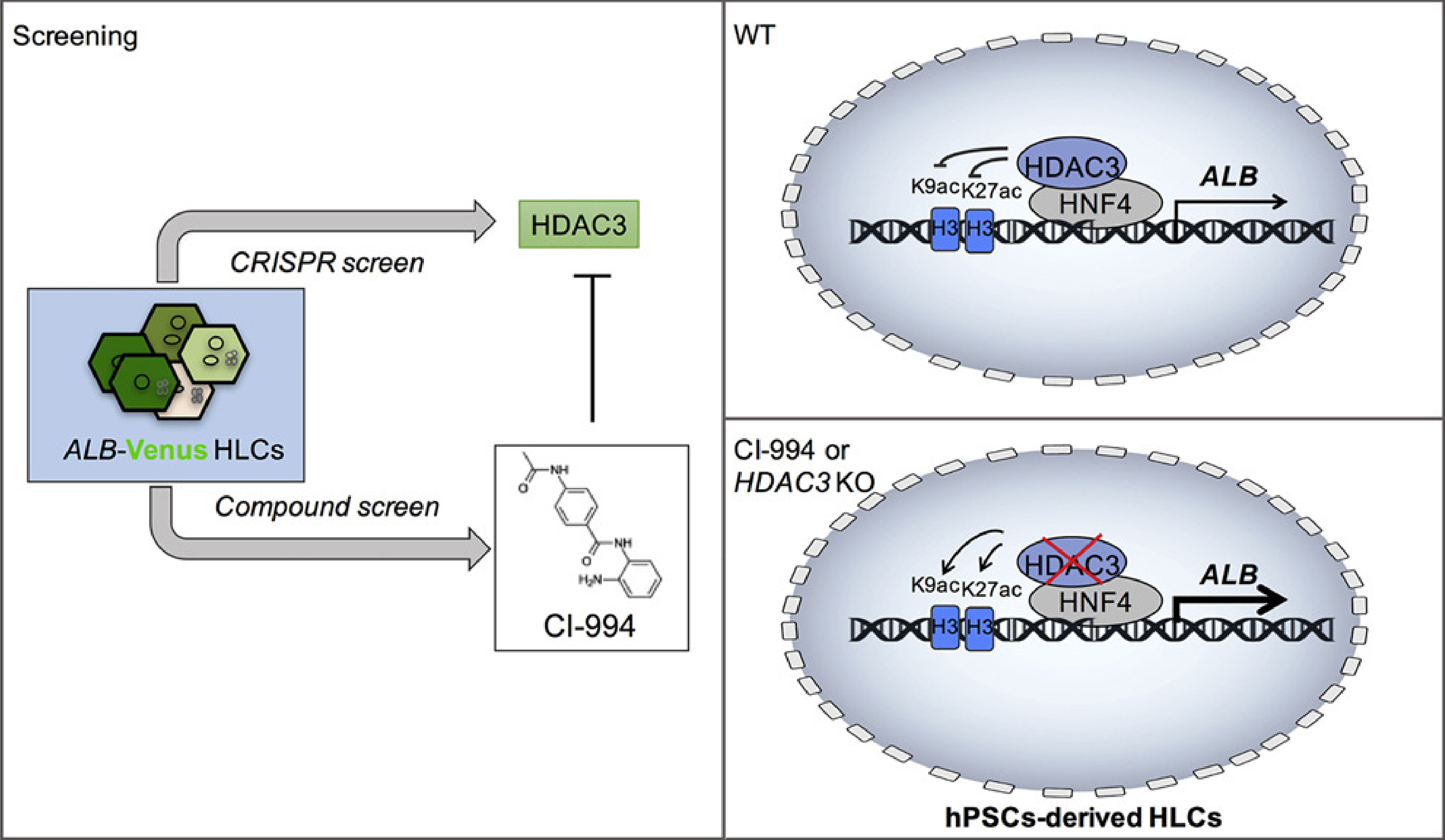 為進(jìn)一步優(yōu)化體外定向分化體系,促進(jìn)肝臟細(xì)胞的成熟和均一化,博士研究生李爽等人在肝臟成熟標(biāo)志物白蛋白(ALB)終止密碼子前定點敲入綠色熒光蛋白(Venus)表達(dá)框,建立了成熟肝臟譜系標(biāo)記的人多能干細(xì)胞報告株。并在此基礎(chǔ)上,運用CRISPR全基因組敲除慢病毒文庫,進(jìn)行了大規(guī)模遺傳篩選,鑒定出ATG7, RPS6KA2, HDAC3等若干基因參與調(diào)節(jié)人多能干細(xì)胞體外肝向分化。同時根據(jù)篩選出的調(diào)節(jié)基因及其相關(guān)功能提示,進(jìn)一步進(jìn)行了有針對性的化合物文庫篩選,發(fā)現(xiàn)一個組蛋白去乙?;感》肿右种苿〤I-994能顯著促進(jìn)HLCs的定向分化;并發(fā)現(xiàn)該小分子同樣能抑制原代肝臟細(xì)胞體外培養(yǎng)過程中肝臟屬性的快速丟失。全基因組敲除慢病毒文庫篩選和小分子化合物庫篩選都證實了組蛋白去乙?;窰DAC3是肝臟分化的重要調(diào)控因子,進(jìn)一步的研究發(fā)現(xiàn)HDAC3可以與肝臟譜系關(guān)鍵轉(zhuǎn)錄因子HNF4等結(jié)合共同調(diào)節(jié)肝臟細(xì)胞分化過程。
