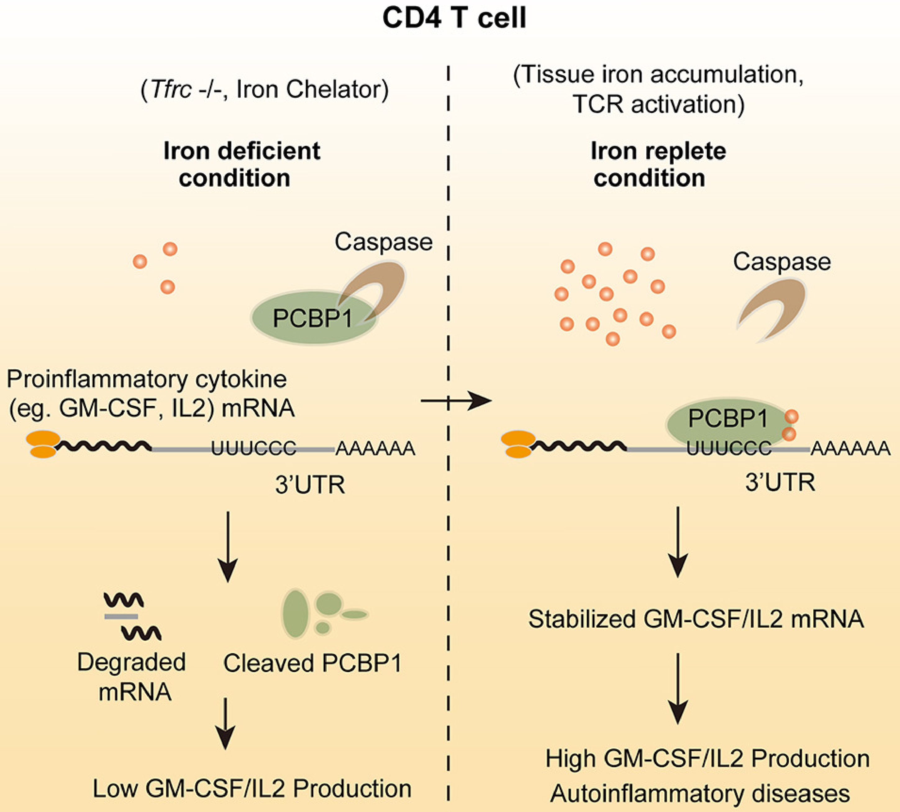 在輔助性T細(xì)胞中,胞內(nèi)鐵離子充足時(shí),PCBP1蛋白穩(wěn)定表達(dá),GM-CSF等促炎性細(xì)胞因子mRNA半衰期延長,從而大量產(chǎn)生細(xì)胞因子;胞內(nèi)鐵離子匱乏時(shí),PCBP1被Caspase剪切降解,GM-CSF等促炎性細(xì)胞因子mRNA半衰期縮短,快速降解,從而使細(xì)胞因子產(chǎn)生受損。