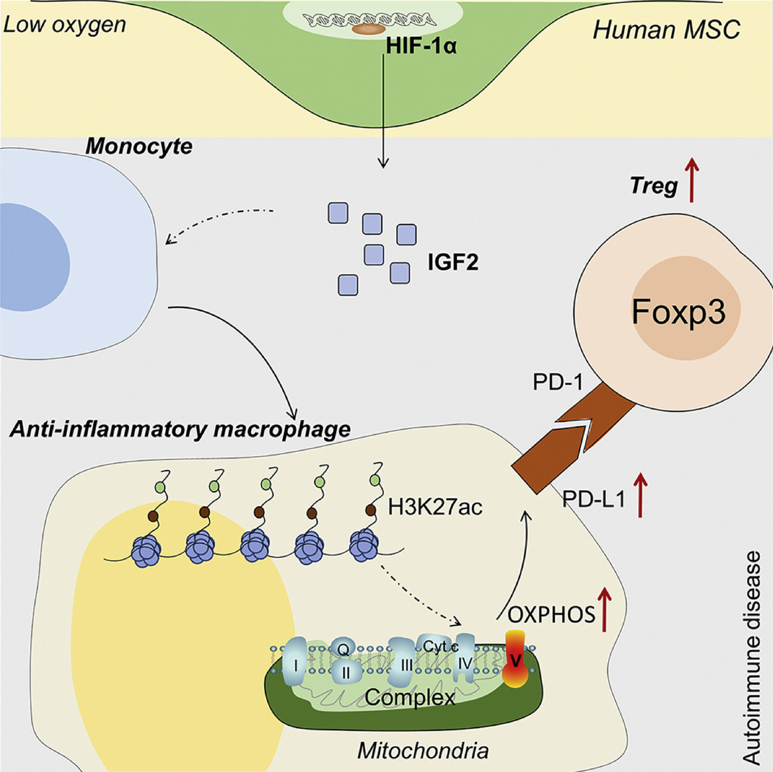 圖注:低氧培養(yǎng)下的間充質(zhì)干細胞通過分泌IGF-2對巨噬細胞進行代謝重編程使其能夠高表達PD-L1并促進Treg分化,以有效治療自身免疫性疾病。