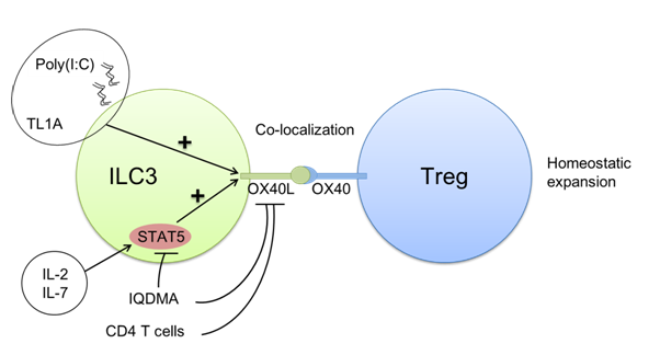 腸道炎癥性疾病嚴重威脅人類健康,Treg是控制疾病發(fā)展的重要細胞類型之一。Treg高表達OX40(OX40L的受體),OX40已經(jīng)被證明對Treg的擴增、存活和記憶都具有重要作用。OX40L過去被報導(dǎo)主要表達在抗原提呈細胞上,小鼠脾臟淋巴組織誘導(dǎo)細胞(lymphoid tisssue inducer, Lti)組成型表達OX40L,小鼠腦膜和人扁桃體中也發(fā)現(xiàn)了OX40L+ ILC3的存在。ILC3是固有免疫細胞的一個亞群,參與機體對抗腸道細菌感染、調(diào)控慢性炎癥和組織修復(fù)。ILC3與T細胞的相互作用廣泛存在,腸道ILC3是否表達OX40L,以及是否通過OX40L對腸道Treg產(chǎn)生影響,這些問題目前并沒有被報導(dǎo)。