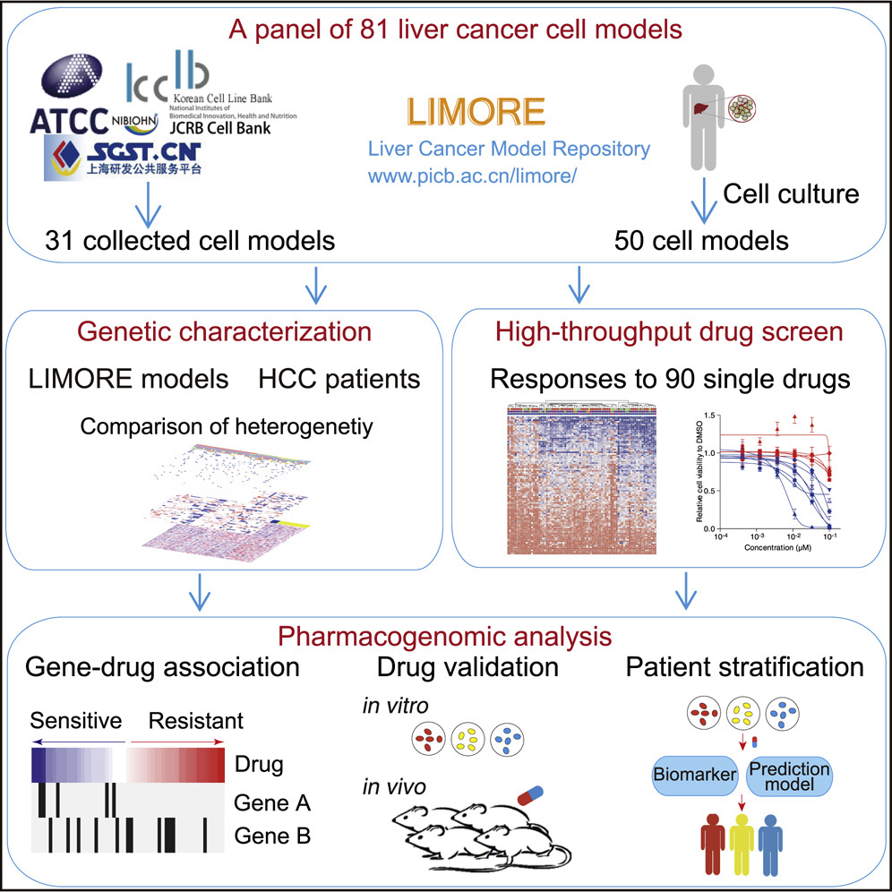 2019年8月1日,國際著名學術(shù)期刊Cancer Cell在線發(fā)表了中國科學院生物化學與細胞生物學研究所惠利健研究組、中國科學院上海營養(yǎng)與健康研究所李亦學研究組、第二軍醫(yī)大學附屬東方肝膽外科醫(yī)院張海斌研究組以及南京大學醫(yī)學院附屬鼓樓醫(yī)院施曉雷合作的題為“A Pharmacogenomic Landscape in Human Liver Cancers”的研究論文。該工作報道了目前最大的肝癌細胞模型平臺和最詳細的肝癌細胞藥物基因組學。通過整合大規(guī)模測序和高通量藥物篩選數(shù)據(jù),研究人員建立了肝癌中基因組變異與藥物響應的相關(guān)性,發(fā)現(xiàn)了新的治療靶點和分子標志物(圖1)。