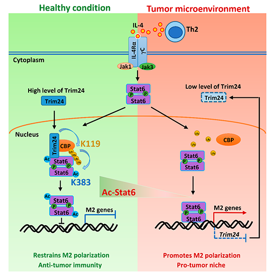 腫瘤微環(huán)境中的免疫細(xì)胞構(gòu)成了腫瘤中的免疫調(diào)節(jié)系統(tǒng),其中具有M2型特征的TAMs(tumor associated macrophages, TAMs)在抑制抗腫瘤免疫并促進(jìn)腫瘤進(jìn)程中起到了重要的調(diào)控作用,然而TAMs向M2極化精細(xì)調(diào)控的分子機(jī)制仍不清楚。本研究發(fā)現(xiàn)在巨噬細(xì)胞M2型極化過程中,調(diào)控極化的關(guān)鍵轉(zhuǎn)錄因子Stat6可以發(fā)生CBP介導(dǎo)的K383位點(diǎn)乙酰化修飾,該位點(diǎn)的乙?;揎椖軌蛎黠@抑制Stat6的轉(zhuǎn)錄活性以及下游M2型特征基因的表達(dá)。隨后,通過高通量轉(zhuǎn)錄組測序(RNA-seq)結(jié)合蛋白質(zhì)譜分析,研究人員發(fā)現(xiàn)了一種Trim家族蛋白的E3泛素連接酶Trim24能夠與乙酰基轉(zhuǎn)移酶CBP結(jié)合,介導(dǎo)CBP蛋白K119位點(diǎn)K63連接的泛素化修飾,增強(qiáng)CBP對Stat6的招募并促進(jìn)CBP介導(dǎo)的Stat6蛋白K383位點(diǎn)乙酰化修飾,從而抑制Stat6的轉(zhuǎn)錄活性以及巨噬細(xì)胞的M2型極化。