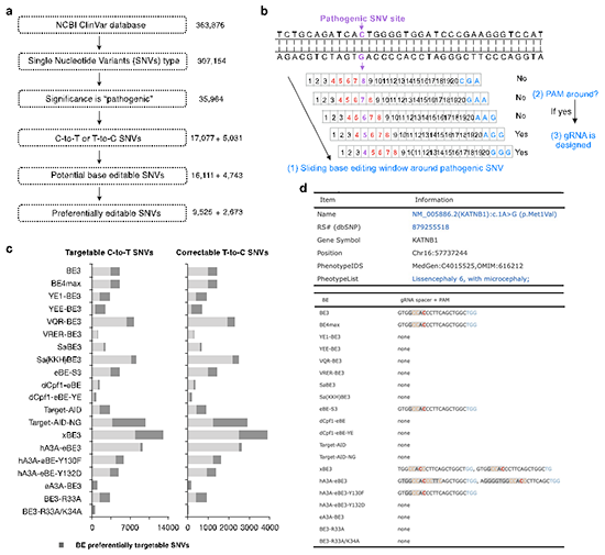 (a)可編輯的人類疾病相關單堿基突變位點的篩選流程。(b)判斷人類疾病相關單堿基突變位點能否被堿基編輯器編輯的流程示意圖。(c)統(tǒng)計20種堿基編輯器可編輯的人類疾病相關單堿基突變位點的數目。(d)BEable-GPS分析顯示一個可編輯的人類疾病相關單堿基突變位點信息及相應單堿基編輯器的gRNA設計結果。