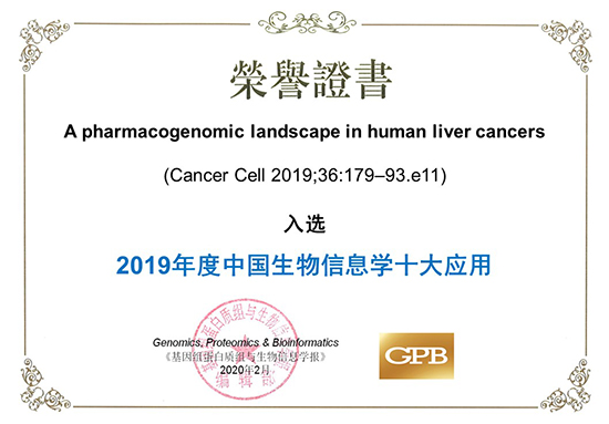 2020年2月,肝癌藥物基因組學(xué)“藍(lán)圖”,通過(guò)《基因組蛋白質(zhì)組與生物信息學(xué)報(bào)》(Genomics, Proteomics & Bioinformatics, 簡(jiǎn)稱(chēng)GPB)組織的領(lǐng)域同行專(zhuān)家評(píng)審,成功入選2019年度“中國(guó)生物信息學(xué)十大應(yīng)用”。該工作是由中國(guó)科學(xué)院生物化學(xué)與細(xì)胞生物學(xué)研究所惠利健團(tuán)隊(duì)、中國(guó)科學(xué)院上海營(yíng)養(yǎng)與健康研究所李亦學(xué)團(tuán)隊(duì)、中國(guó)人民解放軍海軍軍醫(yī)大學(xué)張海斌團(tuán)隊(duì)和南京大學(xué)附屬鼓樓醫(yī)院施曉雷合作完成,于2019年8月在國(guó)際頂級(jí)學(xué)術(shù)期刊Cell旗下子刊Cancer Cell上發(fā)表的研究成果。該成果構(gòu)建了目前最大的肝癌細(xì)胞模型平臺(tái),包括50株新建立的中國(guó)病人來(lái)源的肝癌細(xì)胞系和31株發(fā)表的肝癌細(xì)胞系,重現(xiàn)了肝癌患者的基因組和轉(zhuǎn)錄組異質(zhì)性。通過(guò)整合大規(guī)模測(cè)序和高通量藥物篩選數(shù)據(jù),研究人員建立了肝癌中基因組變異與藥物響應(yīng)的相關(guān)性,發(fā)現(xiàn)了新的治療靶點(diǎn)和分子標(biāo)志物,為索拉菲尼的個(gè)體化治療提供了循證醫(yī)學(xué)證據(jù)。