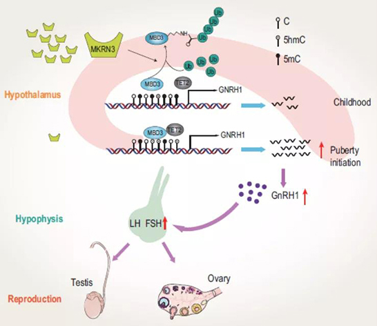 圖1. MKRN3-MBD3-TET2調節(jié)哺乳動物青春期時間模型