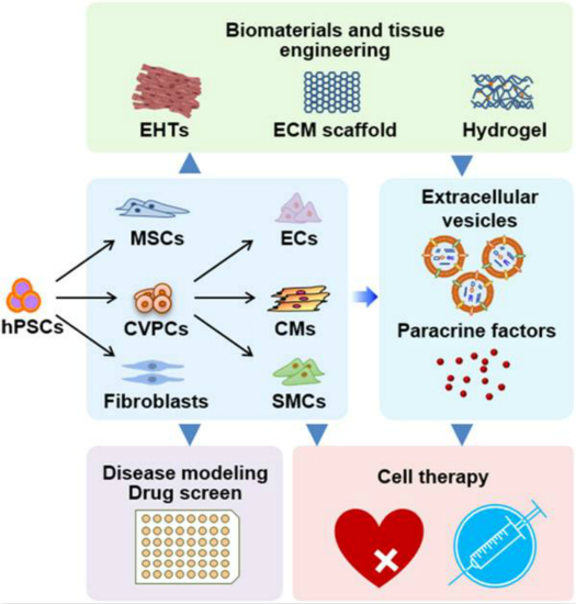 圖示:hPSC衍生心肌譜系細胞在心肌損傷修復、疾病模型、藥物研發(fā)中的應用。