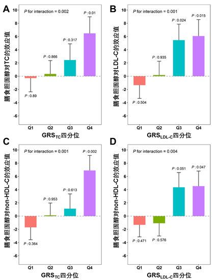 A. 隨著GRSTC的升高,膳食膽固醇對血液TC升高的作用增強;B. 隨著GRSLDL-C的升高,膳食膽固醇對血液LDL-C升高的作用增強;C. 隨著GRSTC的升高,膳食膽固醇對血液non-HDL-C升高的作用增強;D. 隨著GRSLDL-C的升高,膳食膽固醇對血液non-HDL-C升高的作用增強。
