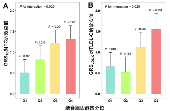 A. 隨著膳食膽固醇的升高,GRSTC對血液TC升高的作用增強;B. 隨著膳食膽固醇的升高,GRSLDL-C對血液LDL-C升高的作用增強。