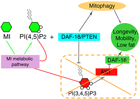 該研究進(jìn)一步發(fā)現(xiàn),myo-inositol延緩衰老依賴于其代謝通路中的另一個酶,daf-18(Pten),該基因有多種功能,研究最多的是其作為抑癌基因的功能。但研究者發(fā)現(xiàn)myo-inositol主要通過daf-18(Pten)提高線粒體自噬的功能實現(xiàn)延緩衰老的效應(yīng)。
