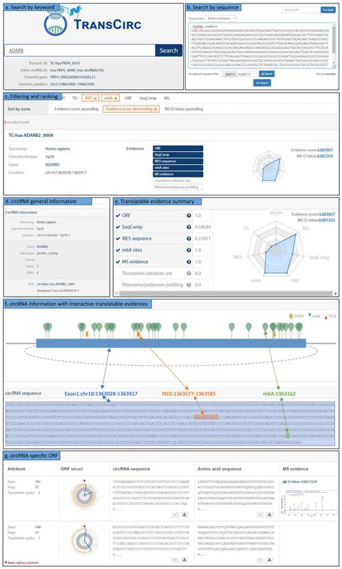 隨著測(cè)序技術(shù)的發(fā)展,目前有大量的環(huán)形RNA被鑒定出來,與之不匹配的是為數(shù)不多的注釋數(shù)據(jù)庫,TransCirc就是針對(duì)這一需求構(gòu)建的基于多組學(xué)證據(jù)的環(huán)狀RNA翻譯數(shù)據(jù)庫。目前,TransCirc中收錄了328080條人類環(huán)狀RNA信息和七類相關(guān)證據(jù),其中:1) 核糖體譜(ribosome profiling)鑒定出與核糖體結(jié)合的環(huán)狀RNA共4284條;2) 含實(shí)驗(yàn)鑒定的翻譯起始位點(diǎn)(TIS)、內(nèi)部核糖體進(jìn)入位點(diǎn)(IRES)和N-6-甲基腺苷修飾位點(diǎn)(m6A)的環(huán)狀RNA分別有10058、314111和40324條;3) 274762條環(huán)狀RNA含環(huán)狀RNA特有編碼框(ORF),其推斷翻譯產(chǎn)物中機(jī)器學(xué)習(xí)預(yù)測(cè)可形成穩(wěn)定蛋白質(zhì)和含質(zhì)譜數(shù)據(jù)(MS)直接支持的分別有194927和168條。除以上數(shù)據(jù)外,TransCirc還提供了友好的搜索/瀏覽界面及輔助分析軟件。TransCirc作為研究環(huán)狀RNA翻譯能力及其編碼肽段功能的重要資源,未來將收錄更多相關(guān)組學(xué)數(shù)據(jù)并將擴(kuò)展覆蓋到其他非人物種。