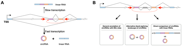 圖示:(A) RNA Pol II的快速轉(zhuǎn)錄會(huì)促進(jìn)環(huán)形RNA的生成。(B) 環(huán)形RNA注釋、可變反向剪接事件和環(huán)形RNA與其對(duì)應(yīng)線形RNA精準(zhǔn)定量及比較。