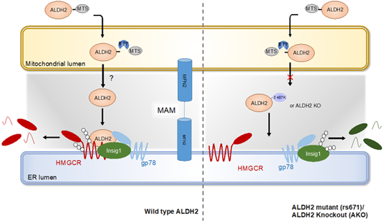 在本研究中,研究人員首先在ALDH2基因敲除以及rs671敲入小鼠中觀察到即使喂養(yǎng)普通食物也引起肝臟和血清中總膽固醇和低密度脂蛋白水平的升高。接著,利用代謝組學(xué)和代謝流分析發(fā)現(xiàn)ALDH2基因敲除小鼠膽固醇合成增加;小鼠膽固醇水平的升高可以被他汀類藥物抑制,提示ALDH2可能參與調(diào)控膽固醇合成酶HMGCR。在細(xì)胞實驗中, 研究人員發(fā)現(xiàn)ALDH2直接影響HMGCR的泛素化降解:ALDH2促進(jìn)HMGCR與Insig1/SCAP/gp78的相互作用,抑制膽固醇合成,這種作用在ALDH2突變體中顯著減弱。進(jìn)一步的機(jī)制研究顯示,在膽固醇升高時,線粒體的ALDH2通過線粒體與內(nèi)質(zhì)網(wǎng)接觸的膜結(jié)構(gòu)(Mitochondria-Associated membrane with ER, MAM)轉(zhuǎn)移至內(nèi)質(zhì)網(wǎng),促進(jìn)HMGCR的泛素化降解。在ALDH2基因敲除或者rs671敲入模型中,HMGCR的蛋白穩(wěn)定性增加從而促進(jìn)膽固醇合成(如圖所示)。該研究發(fā)現(xiàn)了一個膽固醇代謝調(diào)控的新機(jī)制,同時提示在ALDH2突變?nèi)巳盒难芗膊〉娘L(fēng)險增加可能與膽固醇代謝失調(diào)有關(guān);臨床降膽固醇藥物他汀可以有效抑制膽固醇水平的升高。