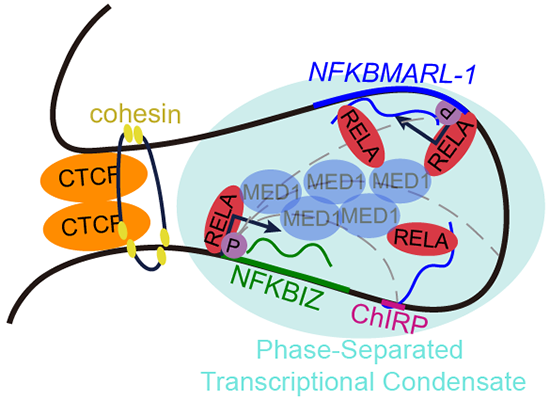為了研究與衰老相關(guān)的lncRNA的潛在功能,研究人員采用guilt-by-association方法基于與蛋白基因表達(dá)的相關(guān)性來預(yù)測lncRNA的功能。發(fā)現(xiàn)腦衰老上調(diào)的lncRNA與免疫功能相關(guān),如NFκB信號(hào)通路和細(xì)胞因子受體;腦衰老下調(diào)的lncRNA與神經(jīng)系統(tǒng)功能相關(guān),如神經(jīng)系統(tǒng)發(fā)育和突觸延伸;而血液衰老相關(guān)的lncRNA與NFκB信號(hào)通路和線粒體功能密切相關(guān)。由于預(yù)測的功能與蛋白編碼基因的功能高度相似,研究人員推測衰老相關(guān)的lncRNA與蛋白編碼基因被相似的信號(hào)通路調(diào)控,并對(duì)腦衰老和血液衰老的lncRNA做轉(zhuǎn)錄因子的motif富集分析,發(fā)現(xiàn)上調(diào)的lncRNA均富集了RELA的motif。通過REMAP ChIP-seq數(shù)據(jù)庫對(duì)lncRNA富集分析同樣發(fā)現(xiàn)NFKB1和RELA的顯著富集。為了研究與衰老相關(guān)的lncRNA是否具有調(diào)節(jié)NFκB信號(hào)通路的功能,在NFκB的報(bào)告細(xì)胞中通過CRISPR篩選調(diào)控NFκB的lncRNA,獲得了顯著調(diào)低GFP(p<0.05)的64個(gè)蛋白編碼基因和72個(gè)lncRNA。通過對(duì)72個(gè)GFP低的lncRNA注釋進(jìn)化年齡、衰老相關(guān)性和啟動(dòng)子區(qū)域的RELA motif,篩選出符合上述三個(gè)條件的13個(gè)與NFκB調(diào)控衰老相關(guān)的lncRNA (NFKBMARLs),并對(duì)它們標(biāo)上在TNFα的單核細(xì)胞和細(xì)胞衰老相關(guān)的反應(yīng),以研究其調(diào)節(jié)衰老相關(guān)表形,重點(diǎn)研究其中NFKBMARL-1對(duì)NFκB調(diào)控通路的信號(hào)機(jī)制(圖2)。采用ChIP-qPCR,RIP-qPCR技術(shù)識(shí)別NFKBMARL-1調(diào)節(jié)RELA結(jié)合NFKBIZ的啟動(dòng)子區(qū)域,發(fā)現(xiàn)NFKBMARL-1參與了RELA的相分離過程。